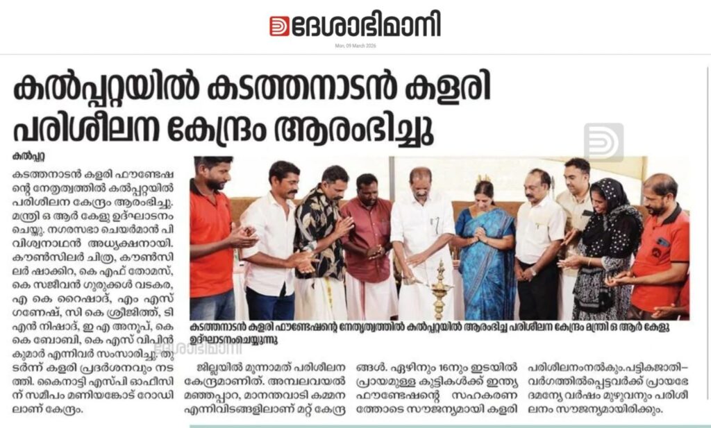 Kalpetta (March 8, 2026): In a vibrant celebration of Kerala’s rich martial arts legacy, the Kadathanadan Kalari Foundation proudly announced the opening of its newest division in Kalpetta. The highly anticipated inaugural ceremony, which took place on Sunday, March 8, 2026, marked a significant milestone in the Foundation’s ongoing mission to preserve, promote, and pass down the ancient discipline of Kalaripayattu to future generations.